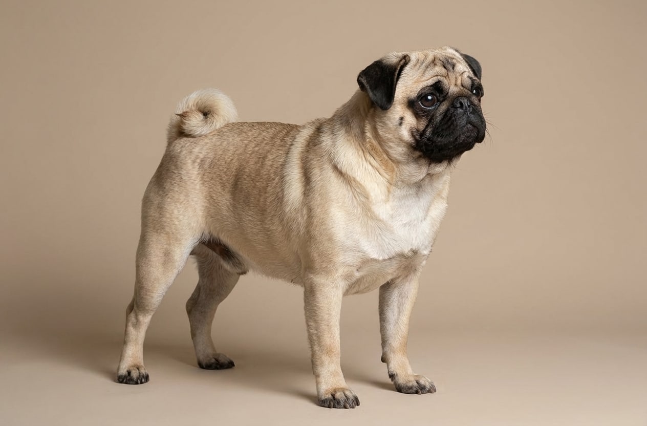 Petite race toy compacte et robuste au visage ridé distinctif à museau court, à la queue enroulée et à la personnalité charmante et espiègle.
